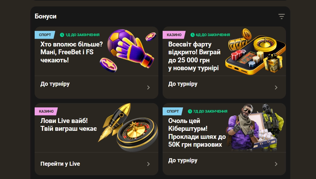 | Бонус за реєстрацію | До 2500 ₴ або фрібет 100 ₴ (залежно від обраного розділу — казино чи спорт) |
